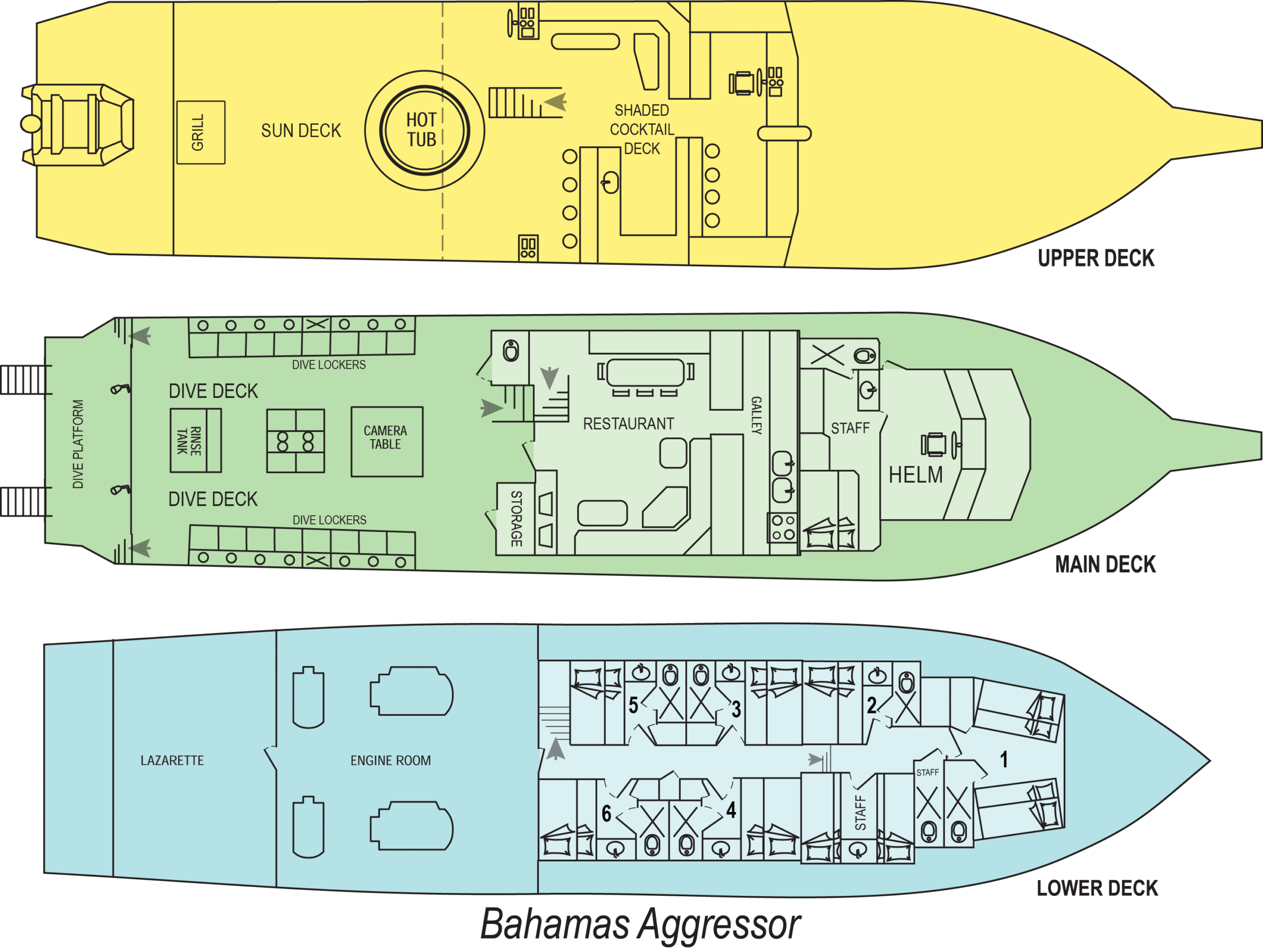 Bahamas Aggressor is a 100-foot yacht with a wide beam for extra stability. The top sundeck is equipped with shaded wet bar, sun loungers and a hot tub … plus plenty of seating for everyone. The restaurant-style dining room & combination lounge is an attractive air-conditioned room with ample space for divers to view their photos and videos or to enjoy a movie on the entertainment system. On the lower deck, you’ll find the cabins.