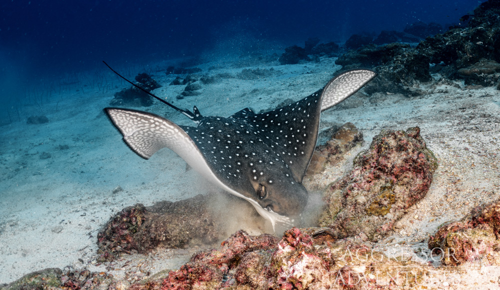 Dove from Chatham Bay, southeast of Manuelita, this site provides a variety of marine life including Frog Fish, lobsters, morays, rays, white tip sharks and hammerheads. There is even a cleaning station.