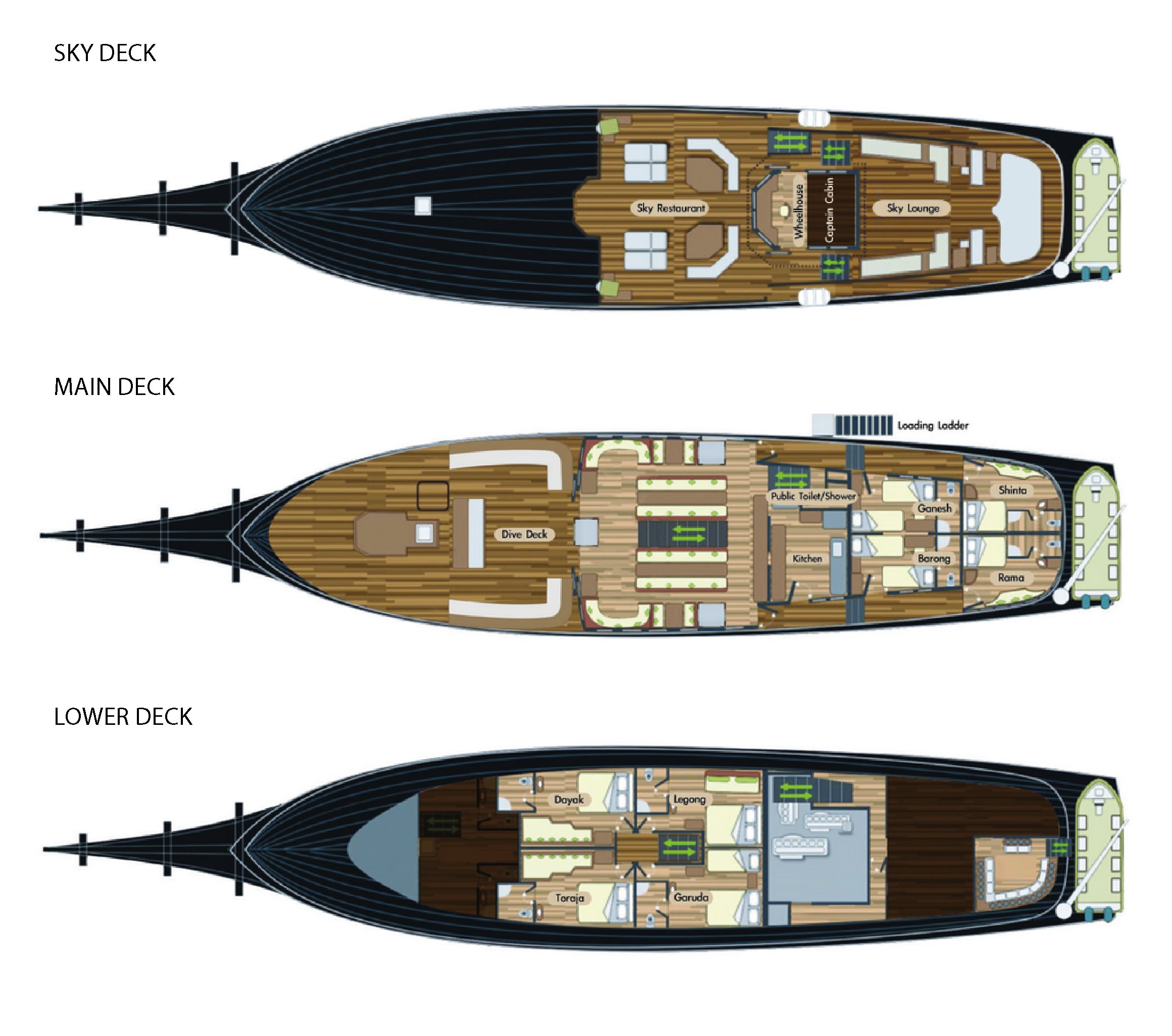 On the sky deck you find, just in front of the bridge, the inviting open-air dining area, a perfect place for fabulous al fresco meals …. and double lounge chairs, each big enough for 2 people & bean bags to snuggle into. Just behind the wheelhouse, you’ll find the large & exotic exterior lounge, with cushioned sunbeds & an exterior shower. A shade canopy is available for those who wish to avoid the direct rays. Just below the al fresco dining, on the main deck, is the spacious interior restaurant / lounge with more than 100 movies to choose from – to watch in the lounge area or for those with an individual DVD player, in the privacy of your own cabin. The main deck features a super-sized dive deck on the fore deck and 4 of the exquisite cabins, including 2 master-suites at the aft of the vessel.