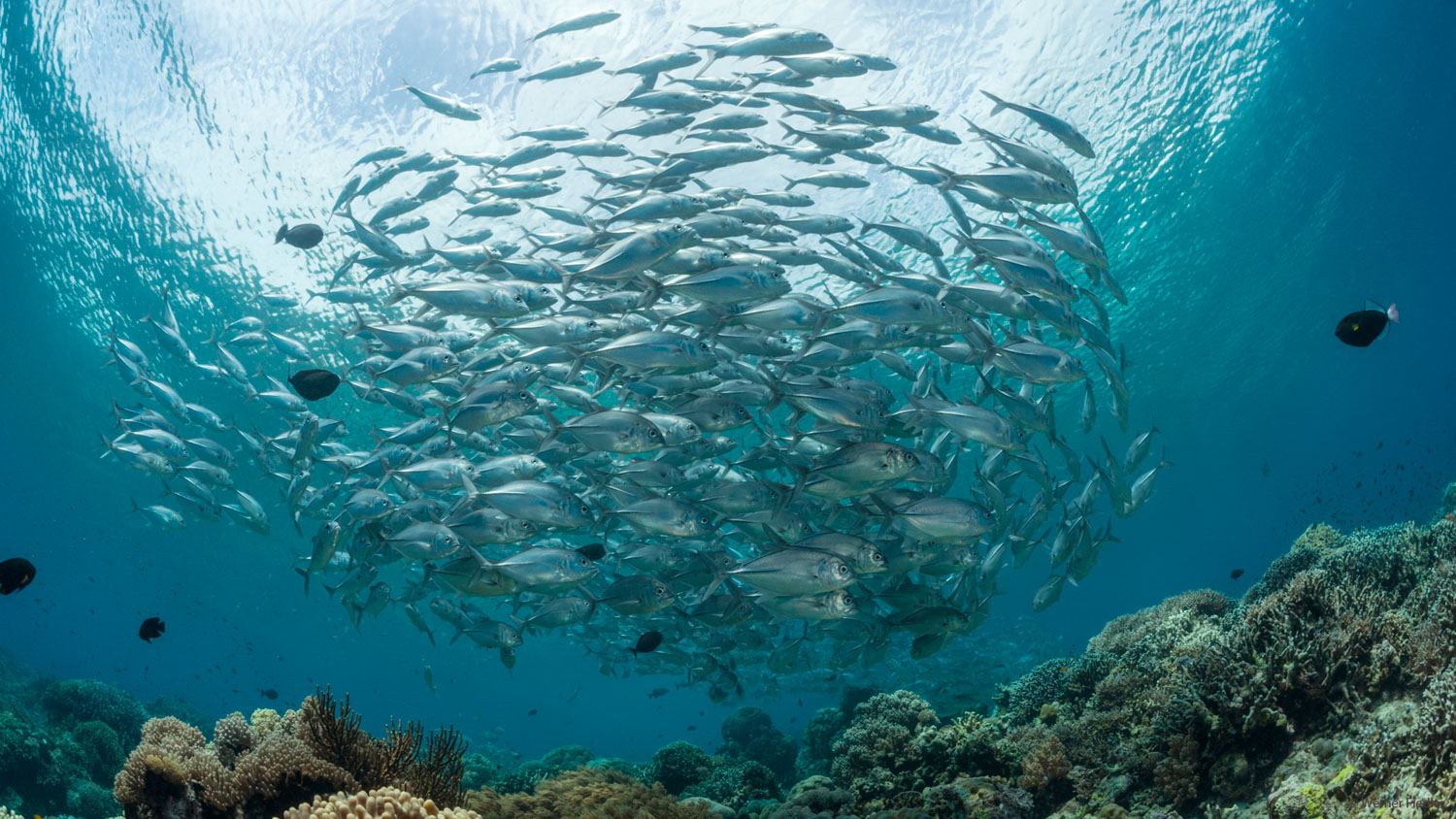 The diversity of the surroundings doesn’t end there. Just 10 minutes away from the resort, larger life forms are bursting out of the ocean: schools of snappers, jacks and bannerfish will whizz by you before you enter the shark zone where white tip and grey reef sharks will be patrolling! This area is furthermore ideal for encountering large marble rays, tuna and napoleons, as well as eagle rays passing overhead.