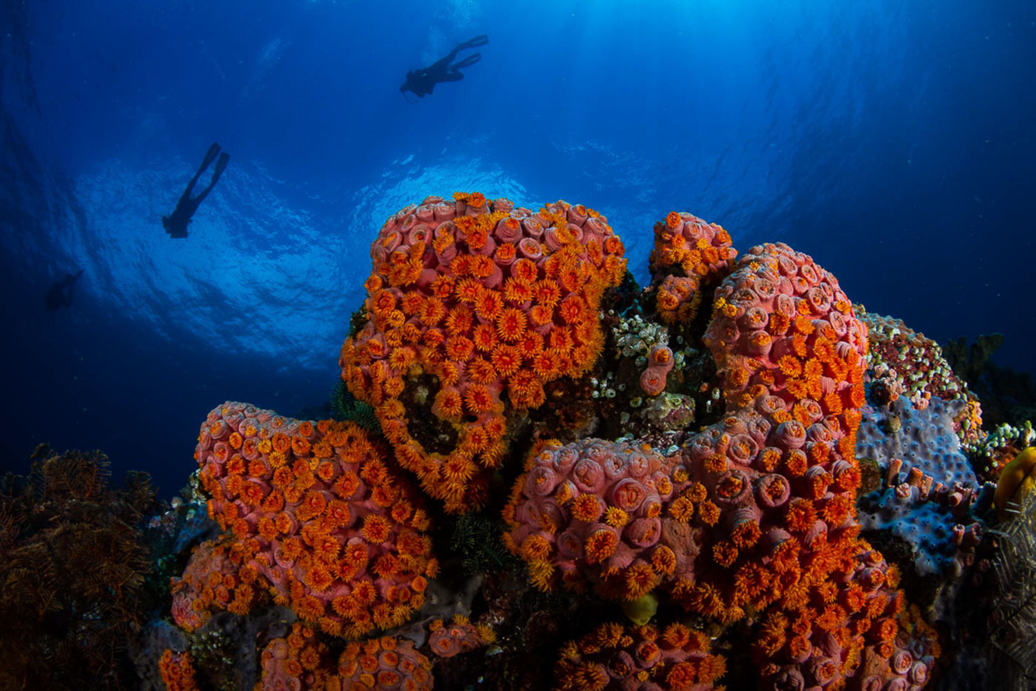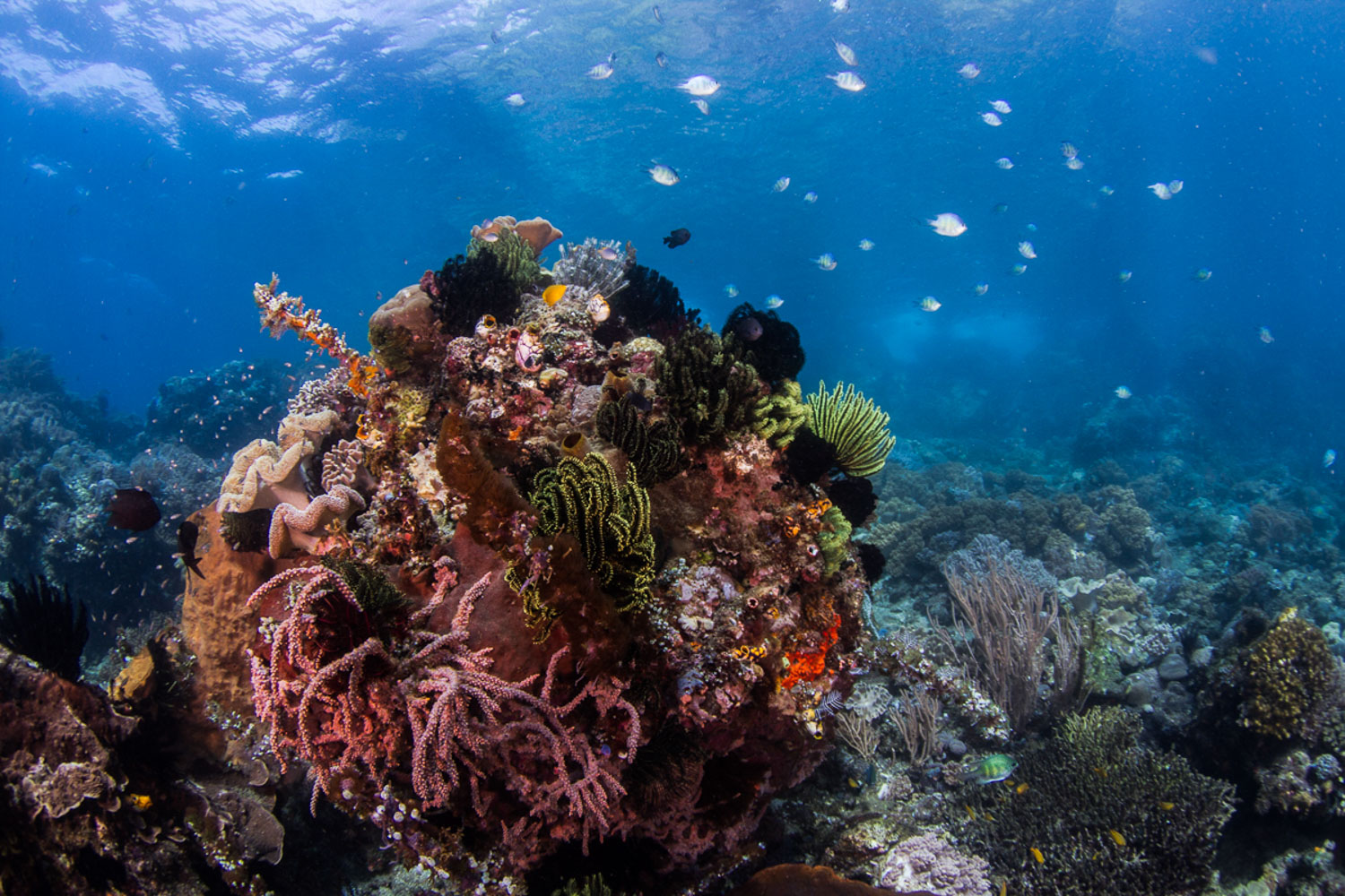 Let’s start just with the basics: you’ll find slopes of black, volcanic sand or white limestone; you’ll dive pinnacles, walls, rocky reefs with soft corals, rubble zones, hard coral reefs (we’ve been told that at least 450 species of hard coral inhabit this area!) . . . . and even shipwrecks.