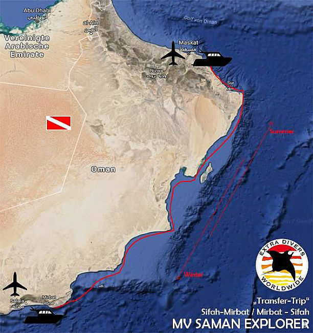 Transfer-Cruise Muscat to Mirbat: At the beginning of the cruise the dive sites of Al Munassir Wreck and Fahal Islands are explore..You’ll then heads southwards along the coast: in 10 days of transit, new and exciting dive sites are often discovered. You’ll mainly encounter different species of smaller rays, leopard sharks and lots of cuttlefish, moray eels, turtles and nudibranchs. The cruise ends with diving the Hallaniyat Islands: humpback whales, pelagic mantas and huge schools of dolphins are not uncommon here. Also off the coast of Mirbat, the last stop of the crossing, there are beautiful old wrecks and masses of fish.